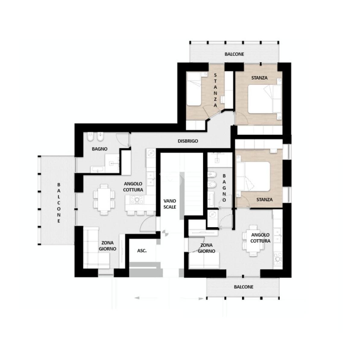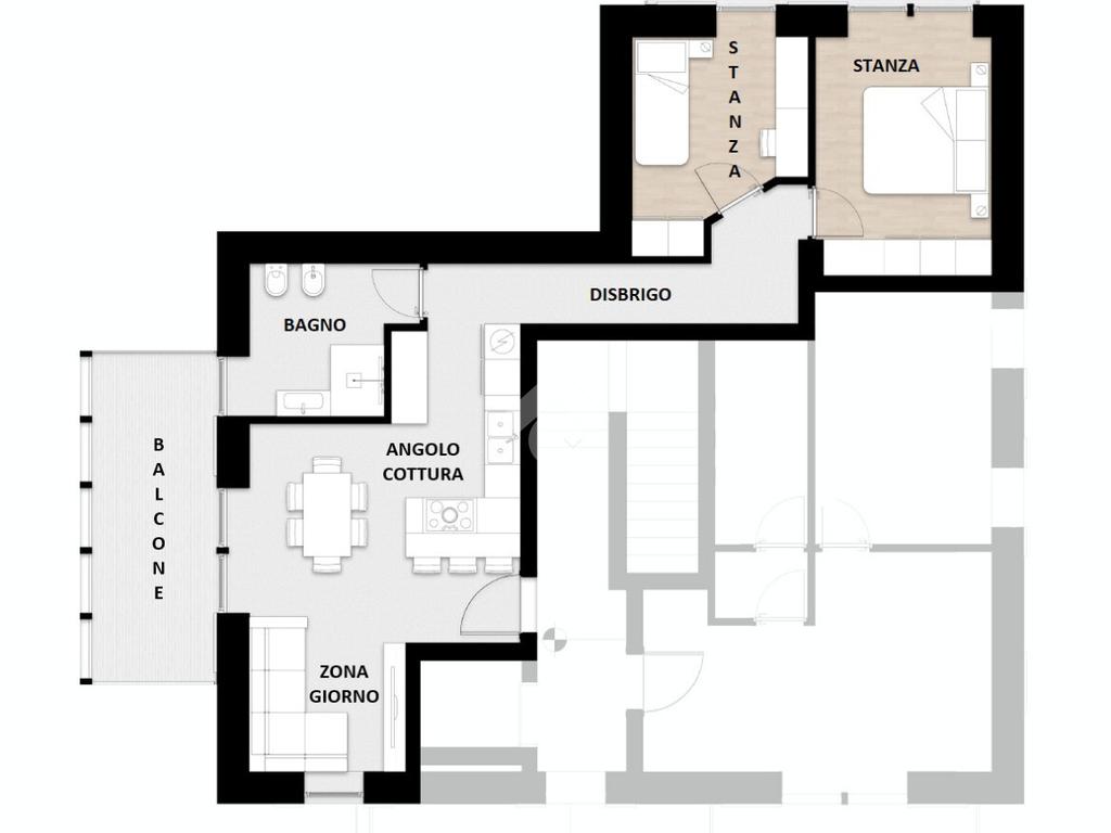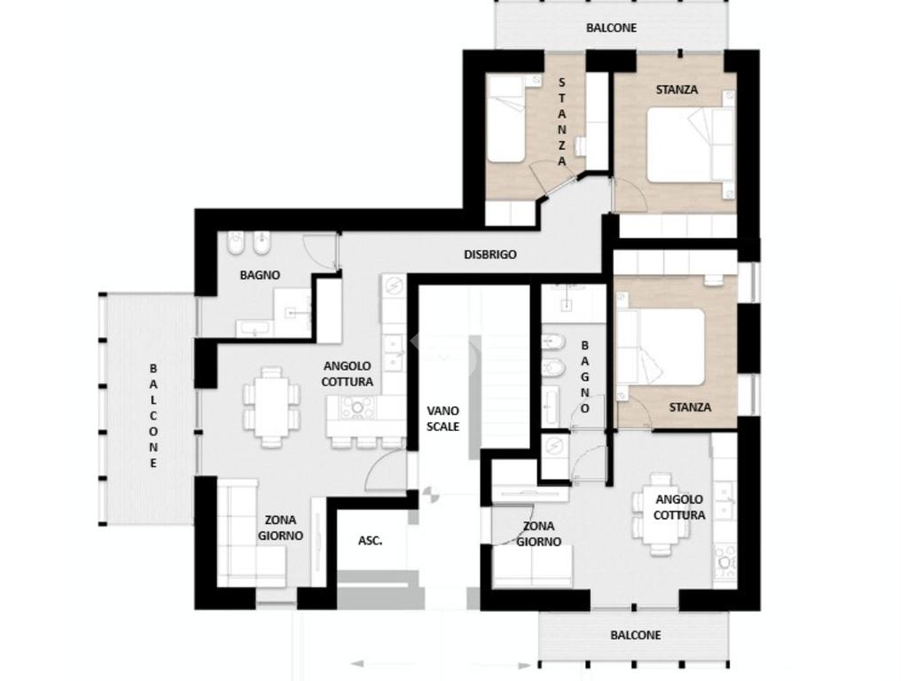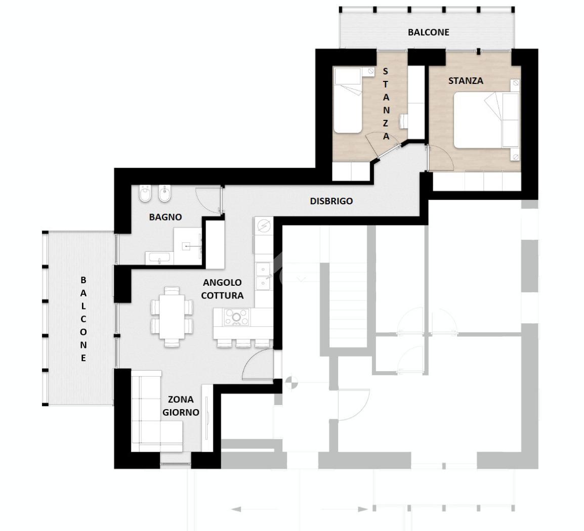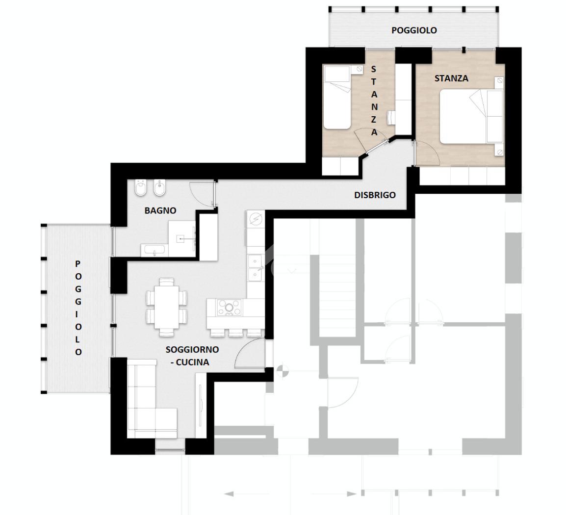 appartamento trilocale nord-sud-ovest a piano mansarda con doppio poggiolo.