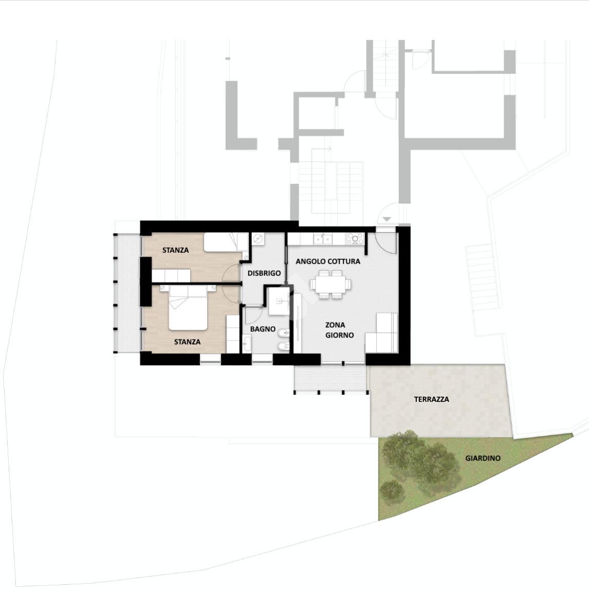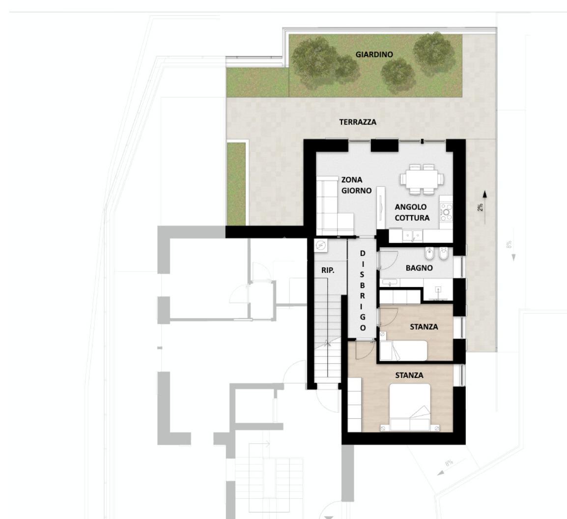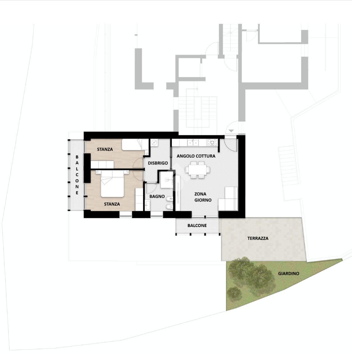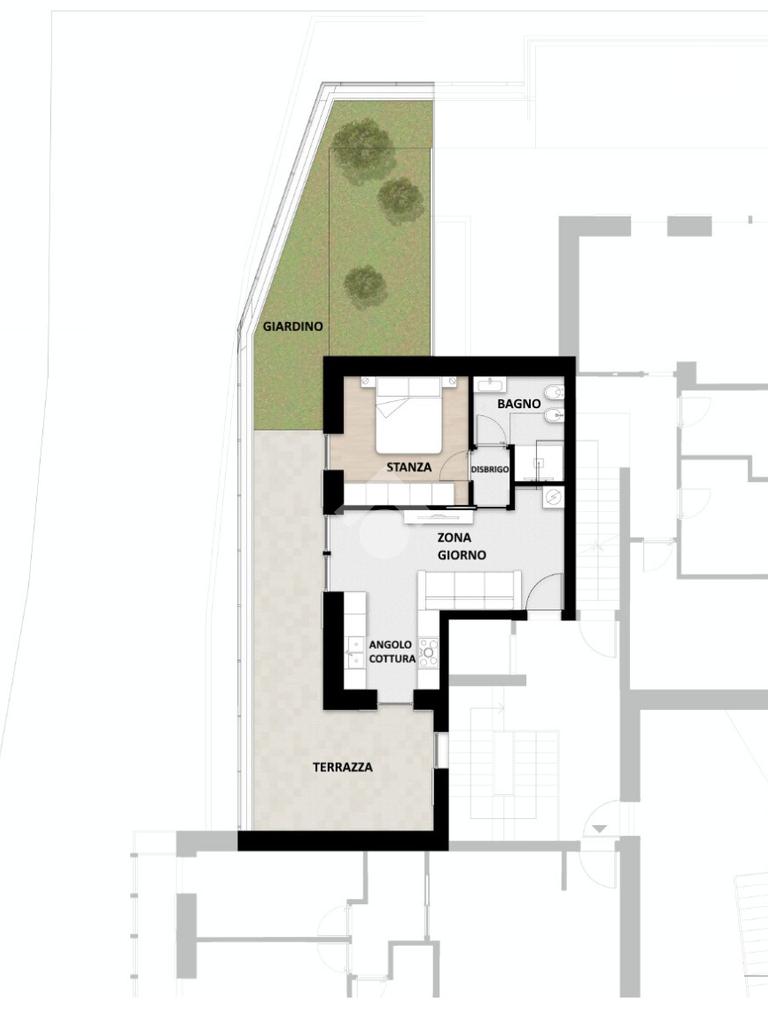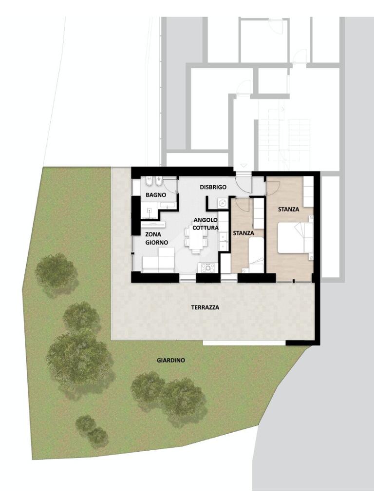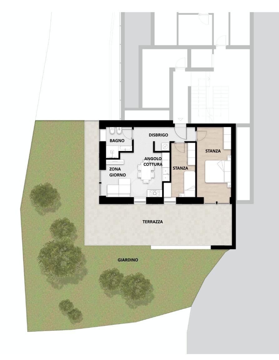 Appartamento bilocale esposto a nord-ovest a piano terra con giardino e terrazzo.