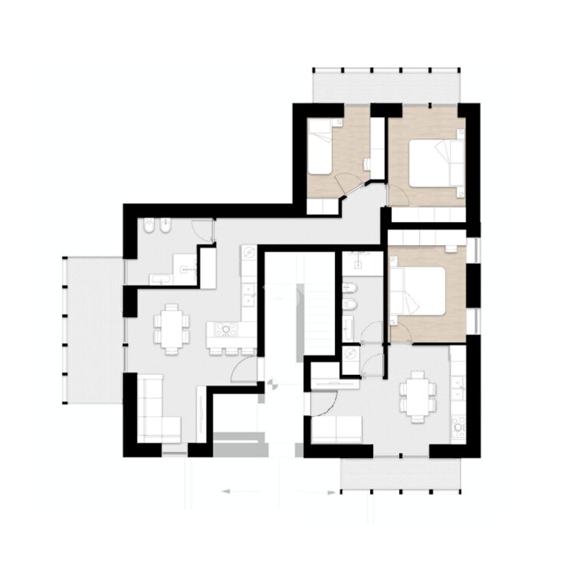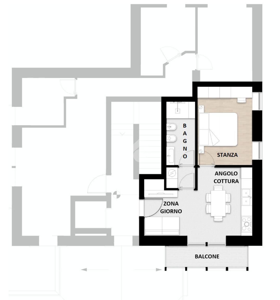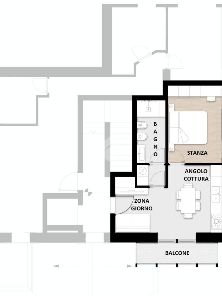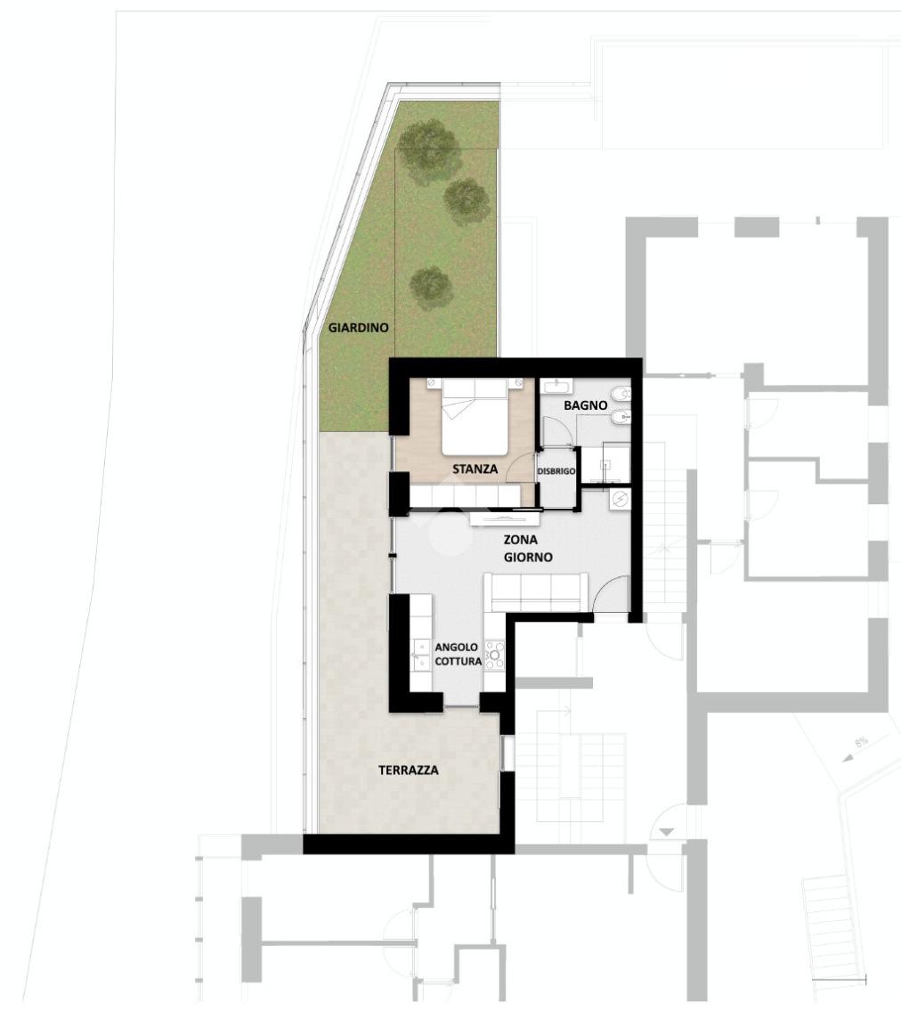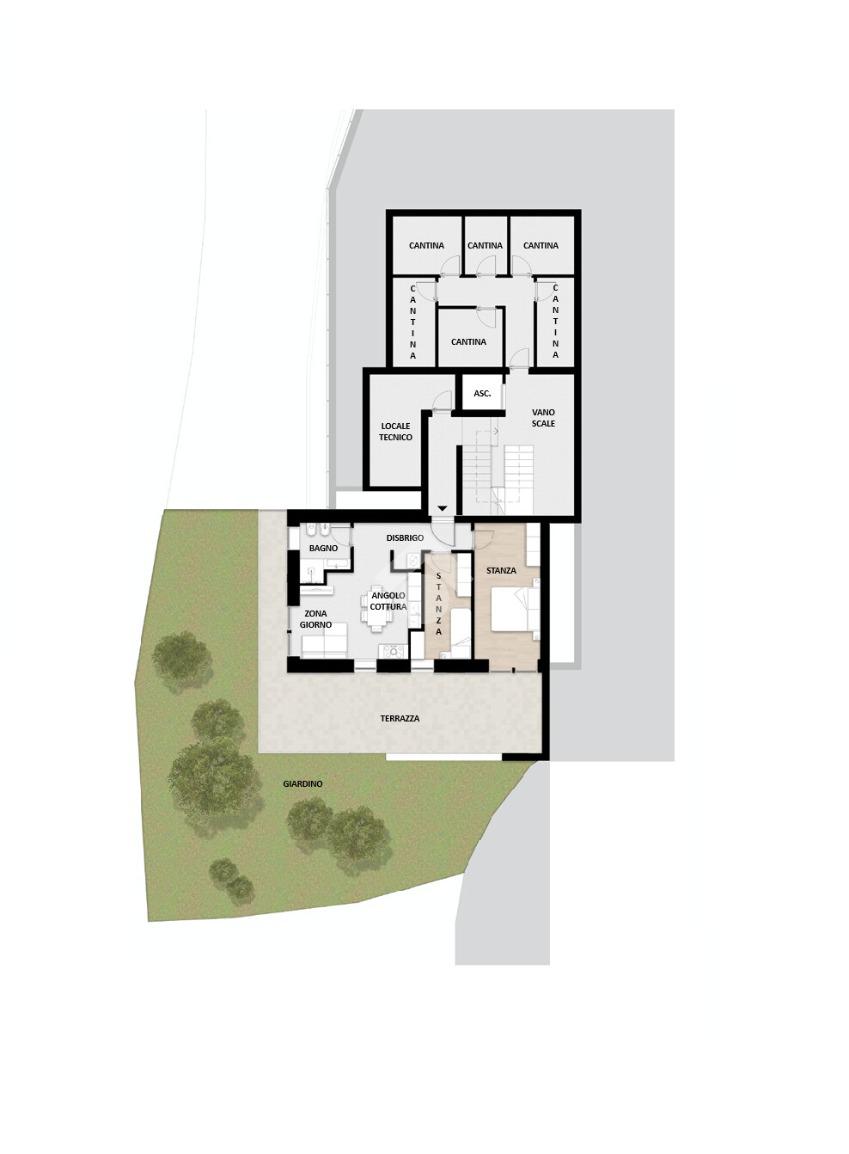 Appartamento bilocale esposto a nord-ovest a piano terra con giardino e terrazzo.